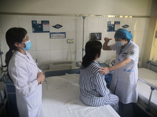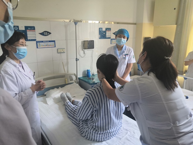 查房开始后,首先由冉向群主任医师向大家说明此次教学查房的目的,提出教学目的及要求。由赵蕊住院医师对患者进行礼节性问候,询问病情,汇报患者病情,潘红帅主治医师进行补充汇报并提出目前患者诊疗存在问题,刘妮责任护师汇报护理计划。赵蕊住院医师及贾凡眩晕技师示范眩晕床旁检查及变位试验。在此过程中,冉向群主任医师及时纠正发现的问题,辅以必要的、正规的示范,结合患者眩晕病情采用解剖模具详细讲解了BPPV疾病分类、发病机理、诊断标准、专科检查,提出了目前最新治疗方案。随后全体医护人员回到医生办公室,各观摩老师结合自身学科特点和带教经验进行了点评,并根据教学目标引导实习医师进行互动式讨论,讨论紧密围绕此次教学查房的目的,结合查体中出现的问题提出了补充意见。
