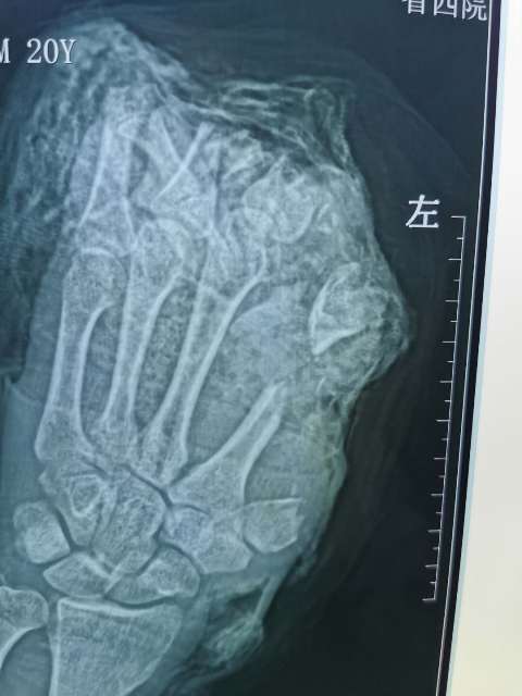10月6日,20岁的小伙在工厂干活时左手不慎被切割机致左手拇指、示、中、环指完全离断;左小指开放伤伴肌腱神经血管离断;大鱼际皮肤软组织、环指中末节部分缺损、第一掌骨、第二掌骨部分缺损,鲜血直流。被工友慕名紧急送往我院骨二科进行救治。