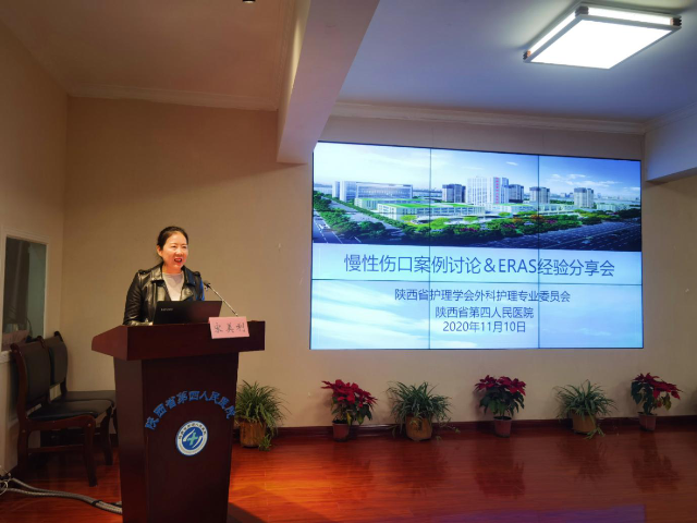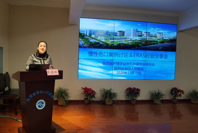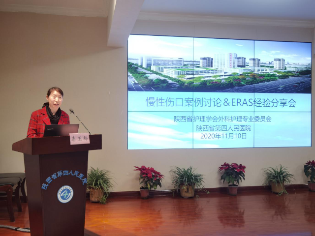 为提升我院外科专科护士在慢性伤口处理中的临床实践技能,促进ERAS新理念在临床工作中的开展,提高我院外科护理专业品质。11月10日下午,陕西省护理学会外科专业委员会携手陕西省第四人民医院成功举办了慢性伤口案例讨论&ERAS经验分享会,会议采取了线上线下同时进行的分享形式。省护理学会外科专委会主任委员李玉梅,西安国际造口治疗师学校副校长乔莉娜,省护理学会伤口造口失禁专业委员会常务委员宋美利,省护理学会外科专业委员会副主任委员仵晓荣应邀参加了会议。我院党委书记李广勤,党委副书记、院长贾延,副院长刘彦君、聂书伟、陈晨,伤口组成员,开展ERAS的医护团队及全院主任护士长共计100余人参加了会议。线上2000余人通过线上直播学习聆听了本次会议。