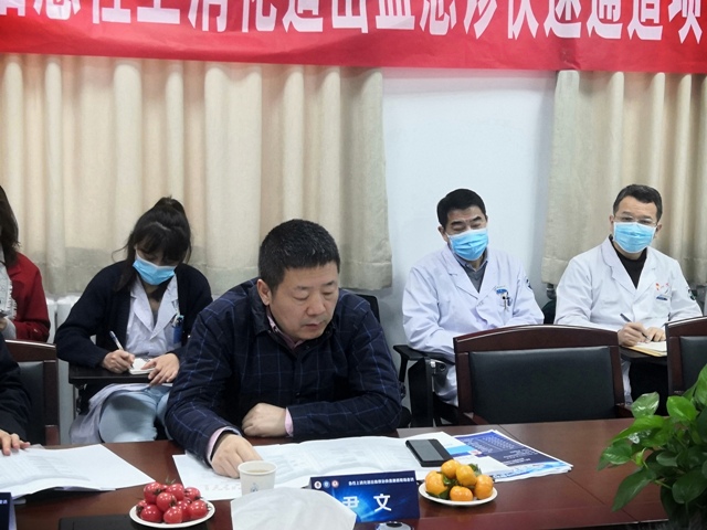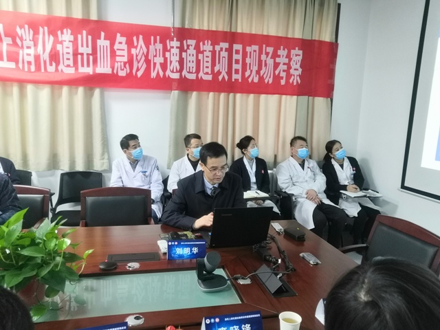 贾延致欢迎辞,对尹文教授、刘明华教授等专家组一行莅临评审表示热烈欢迎,对专家组给予专业指导表示感谢,并简要介绍了医院关于提高危急重症救治水平、推进急性上消化道出血急诊快速救治通道体系建设的相关情况。他说,医院对“急性上消化道出血急诊救治快速通道”项目建设非常重视,参照胸痛中心、卒中中心等5大中心建设模式创建,急性上消化道出血急诊救治快速通道项目建设是医院5大中心的重要组成部分,在急危重症患者救治中发挥着重要作用。此次急性上消化道出血急诊救治快速通道建设项目由急诊医学科牵头、消化内分泌科、普外科、介入导管室、麻醉科、重症医学科等多学科联合创建实施,是又一项惠及百姓健康的大举措。项目自启动以来,不断优化诊疗流程,通过MDT团队合作,为急性上消化道出血患者提供绿色通道,给予快速高效救治,提高了救治成功率。