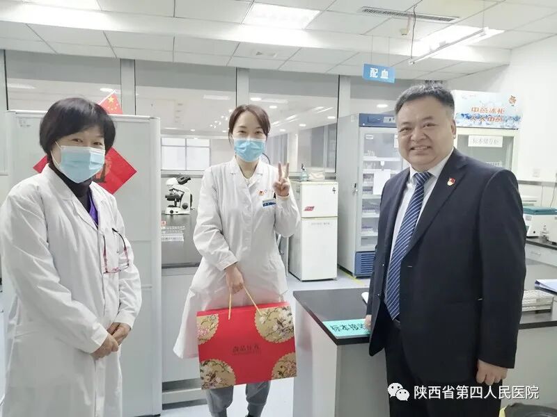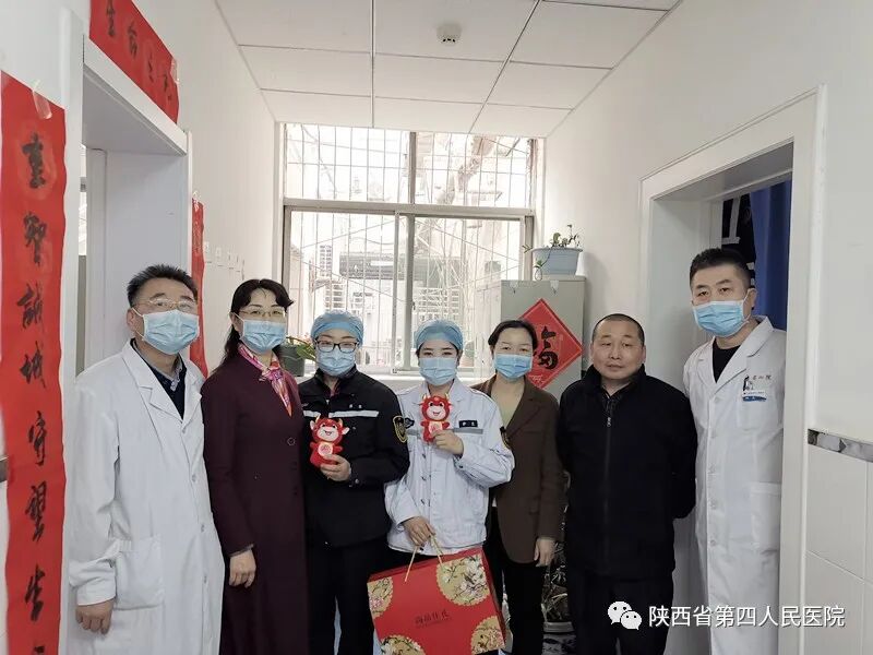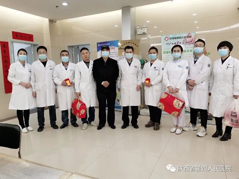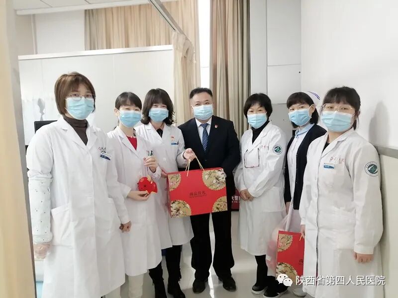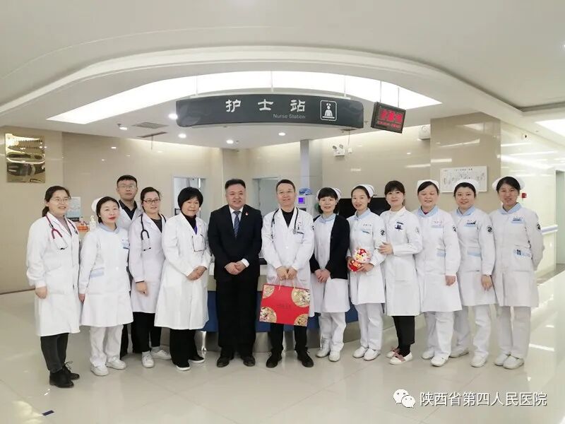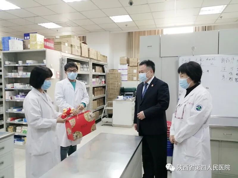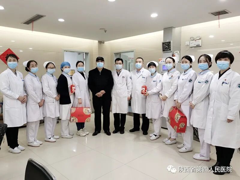 2021年2月10日大年三十,早上8时半,陕西省第四人民医院党委书记李广勤、院长贾延等院领导在医院主要职能部门负责人的陪同下,来到医院各科室,向坚守在一线岗位的工作人员和住院患者表示亲切的慰问,并向他们送上新年祝福,恭贺新春。