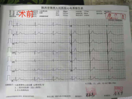 3月10日,83岁的高龄老人王某某坐着轮椅来到陕西省第四人民医院门诊。这一次与以往不同,他没有到内分泌科及肾内科求治,而是来到了心内科专家门诊陈中升主任医师的诊室。患者因1月来出现明显疲倦、乏力伴胸闷,到当地医院行心电图检查提示间歇性Ⅲ?房室传导阳滞,多次调整治疗并口服心宝丸,症状无减轻,通过医生建议来到了陕西省第四人民医院。陈医生仔细查阅了老人的病例资料,再次详细询问病史,了解到老人有着多年的糖尿病史合并慢性肾功能不全,目前突发严重恶性心律失常,随时会发生晕厥、甚至 Adams- Strokes综合征发作,严重时可发生猝死。