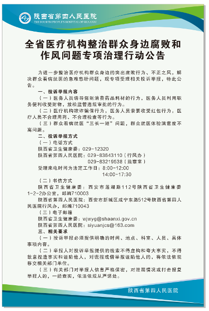 陕西省第四人民医院关于整治群众身边腐败和作风问题 专项治理行动举报的公告