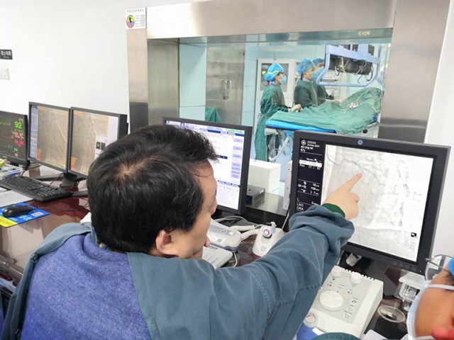 11月10日15时58分左右,家住医院附近的中年男性辛先生在家人陪伴下来到我院急诊内科门诊诊室,满头大汗,捂着胸口说胸痛、胸闷、气短,急诊科主治医师钟高亮立即安排床位进行留观给予吸氧、心电监护、查体,心电图提示:1、窦性心律;2、室性早搏;3、急性下壁、前壁心肌梗死,诊断:急性冠脉综合征、心肌梗死。随后患者在急诊科留观室病情突然加重,意识丧失、四肢抽搐、面色苍白、全身大汗、呼吸急促,心电监护提示心室颤动,判断其可能为急性心肌梗死心源性休克,急诊科和心内科医生立即行胸外心脏按压,电除颤三次等对症治疗,立即启动胸痛患者抢救应急预案,开启绿色通道,和患者家属谈话,为其迅速办理入院手续,给予升压补液扩容等抢救治疗,积极完善术前准备,联系医务科和介入导管室,于16时22分将患者转运至导管室,心内科主任、主任医师王选琦带领团队副主任医师孙耀林、王崇振,主治医师马艳萍共同夺取患者最宝贵生命时间,为患者选择了从下肢股动脉穿刺造影,从穿刺到开通血管用仅仅只用了十一分钟。16时33分顺利完成PAG PCI支架植入术后成功再通,患者转危为安,随后入住心血管内科CCU病房继续治疗。