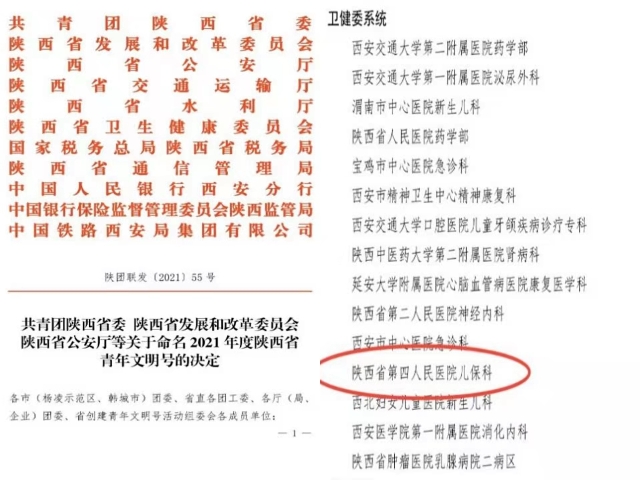 近日,我院儿保科成功获得共青团陕西省委授予的2021年度省级青年文明号称号,成为我院继急诊科、手麻科后,第三个获得荣誉的青年集体。