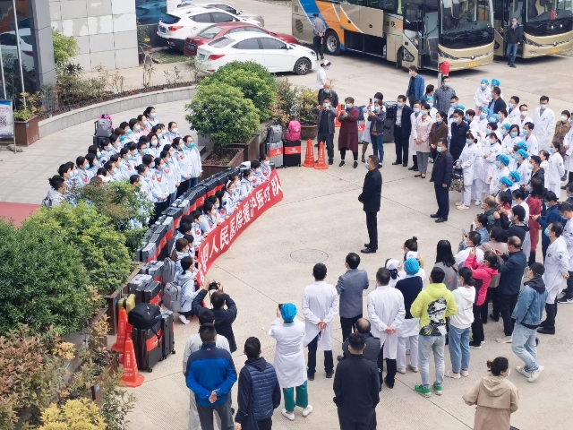 4月15日上午,医院党委领导班子为援沪医疗队举行了简短的出征仪式,有关职能部门、临床科室主任、护士长一同参加了出征仪式。