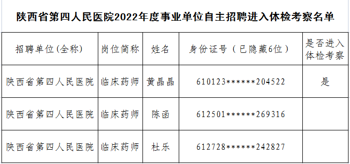 按照工作安排, 2022年陕西省第四人民医院自主招聘工作人员面试工作已经结束,现将进入体检考察人员名单予以公示(详见附表)。体检有关事项另行通知。