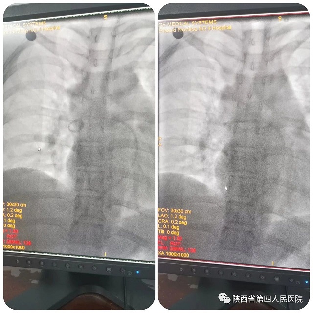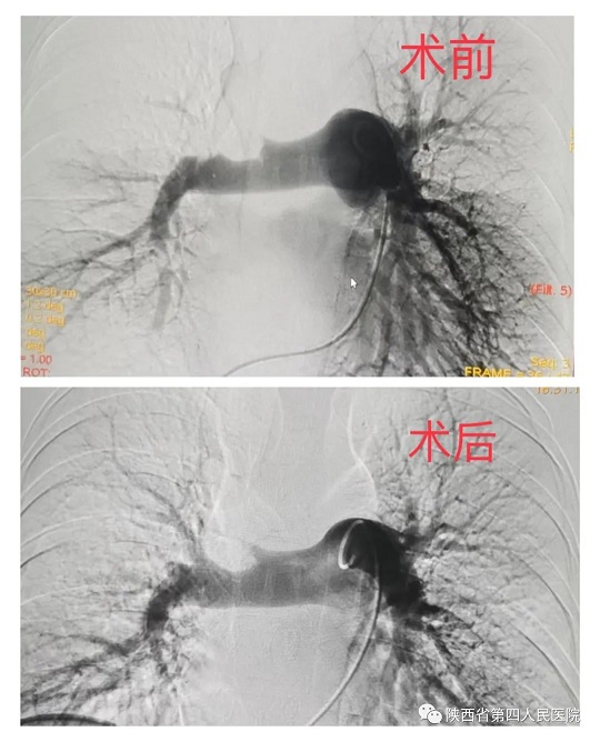 随即患者收入我科心脏重症监护病房,经心血管内科介入手术团队讨论,王选琦主任表示患者病情危急,时间就是生命,若不及时救治,随时有猝死的可能,立即决定为该患者进行急诊手术。因手术难度高、风险大,向患者家属详细交代病情,在取得同意后,在王选琦主任的指导下,主刀医生赵骞及王崇振医生、仇俊玲副主任,在局麻下成功为患者实施了急诊手术:下腔静脉造影+肺动脉造影+肺动脉捣碎栓术+肺动脉血栓抽吸术+下腔静脉滤器置入术。凭借我科医生精湛的技术,手术历时2小时50分钟,成功完成,术后患者生命体征平稳,血氧饱和度明显上升,胸闷、胸痛、气短症状明显改善,恢复良好,治疗效果得到了患者及家属的认可。