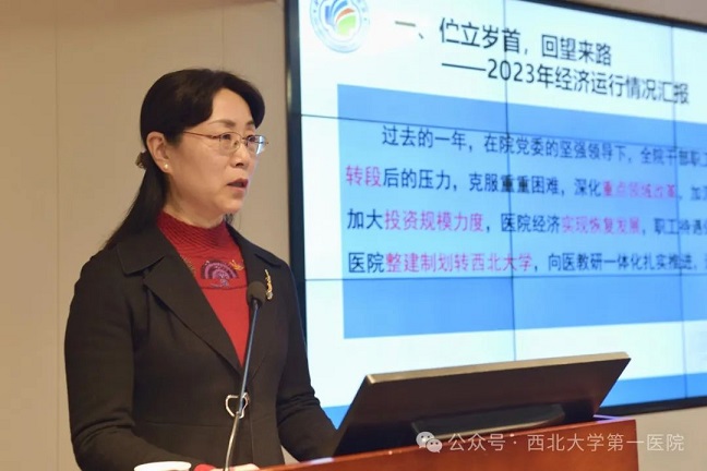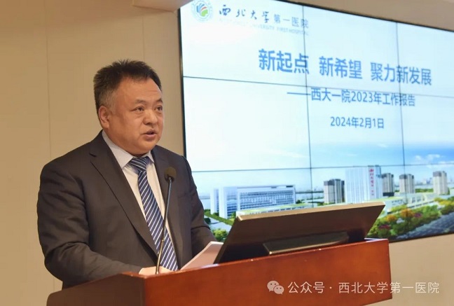 会上,院长贾延以《新起点、新希望、聚力新发展》为题,全面总结了医院2023年度取得的成绩,同时安排部署2024年度医院重点工作。他从党建引领、机构划转、学科建设、医护质量、运营管理等十个方面回顾了2023年医院的工作。他指出,2023年医院认真开展习近平新时代中国特色社会主义思想主题教育,划转西大平稳有序,稳步推进群众身边腐败问题集中整治工作,修订完善医院十四五规划,薪酬绩效修订方案落地实施,积极应对新冠疫情的新变化,有序开展呼吸道感染疾病医疗救治,创新医疗管理新思路,强化医疗护理质量管理,完善医疗辅助服务体系建设,不断改善群众就医感受,医院各方面工作稳定进步。贾延院长在报告中对2024年的十项重点工作做了安排部署。他强调,2024年要坚持以人民健康为中心,聚精会神把学校十四次党代会精神和医院“十四五”发展规划落实落细,认真落实全省卫生健康会议精神,积极适应医药卫生体制改革的新要求,敢于面对医院发展过程中面临的困难和问题,思维革新,凝心聚力,以精细化的管理,推动服务型组织建设,推动医院医教研协调发展,为学校医学教育的发展和“双一流”学校建设肩负起责任和担当。