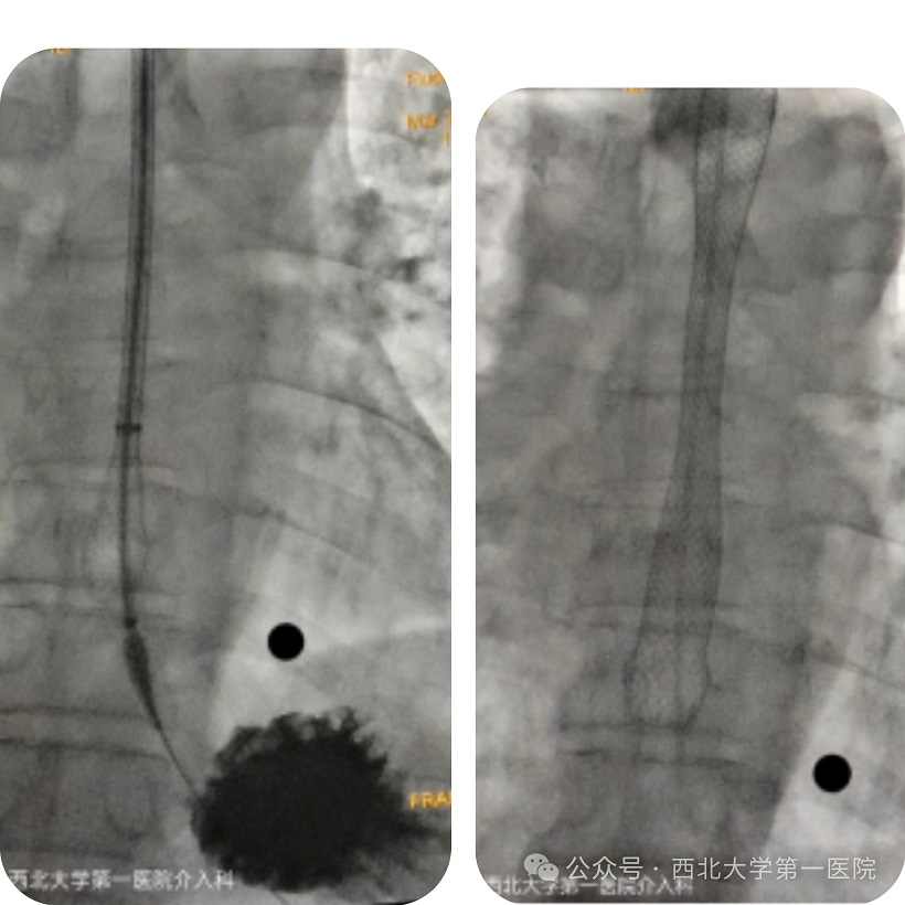 该患者一年前在当地医院诊断为食道癌,经过化疗和放疗后,随着病情逐渐发展,刚开始还能进食流质,后逐渐无法进食,饮水困难,随即来我院介入科诊治收住入院。完善胸部增强CT和食道造影,提示食道上下段均狭窄,针对患者的病情介入科立即组织临床营养科、消化内科等多科室会诊,为重度营养不良、低钠、低蛋白、贫血等,会诊专家建议尽快手术治疗。