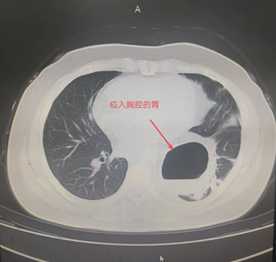 患者辛某,今年85岁,1年前患者因反酸、进食后反复呕吐于外院就诊。胸腹部CT检查提示:膈疝。胃十二指肠镜检查提示:食管外压性改变,膈疝,食管裂孔疝。患者长期营养不良,无法经口进食,只能通过鼻饲-空肠营养管置入进行营养,近日因营养管再次出现导管堵塞,随后被家人紧急送往我院住院治疗。住院后进一步检查诊断食管裂孔疝、肺部感染,既往患有脐疝、胸椎手术史,合并心律失常、低氧血症、代谢性酸中毒、肺大疱、心脏瓣膜疾病、左侧颈动脉斑块形成、腔隙性脑梗塞等老年病史。