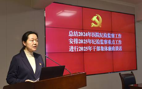 会上,首先进行警示教育,全体参会人员观看了医疗反腐专题警示教育片,通过典型案例强化廉洁意识。随后,医院纪委书记王培作纪委工作报告,全面总结了2024年纪检监察工作,安排部署了2025年重点工作。医院副院长赵钢对2025年医院行风建设工作进行安排部署。院党委书记陈晨总结了医院2024年全面从严治党工作,分析当前形势,部署2025年医院全面从严治党各项工作任务,并与支部书记代表签订了2025年全面从严治党责任书。