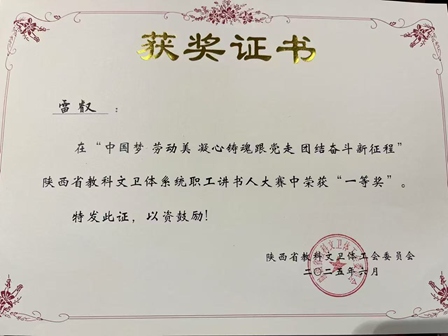 6月25日,由陕西省教科文卫体工会主办的"中国梦·劳动美——凝心铸魂跟党走 团结奋斗新征程"全省教科文卫体系统职工讲书人大赛决赛在陕西省图书馆圆满落幕。来自40个省级单位的45名选手同台竞技,我院重症医学科雷叡凭借对《大医精诚》的深刻诠释与深情演讲,荣获大赛一等奖,充分展现了我院职工的人文素养和新时代医者的精神风貌。