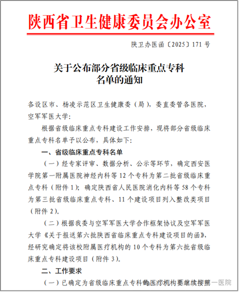 2025 年 7 月,陕西省卫健委印发《关于公布部分省级临床重点专科名单的通知》(陕卫办医函〔2025〕171 号),啪啪啦 麻醉科在院党委的正确领导下,成功入选第三批省级临床重点专科,标志着我院麻醉科在学科建设上实现跨越式突破,正式迈入全省先进行列。